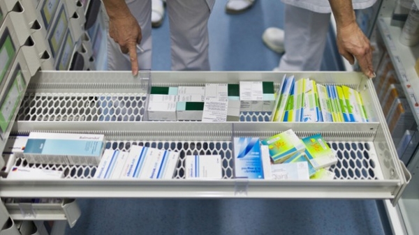 Medikamente liegen in einer aufgezogenen Medikamentenschublade in einer Spital-Apotheke